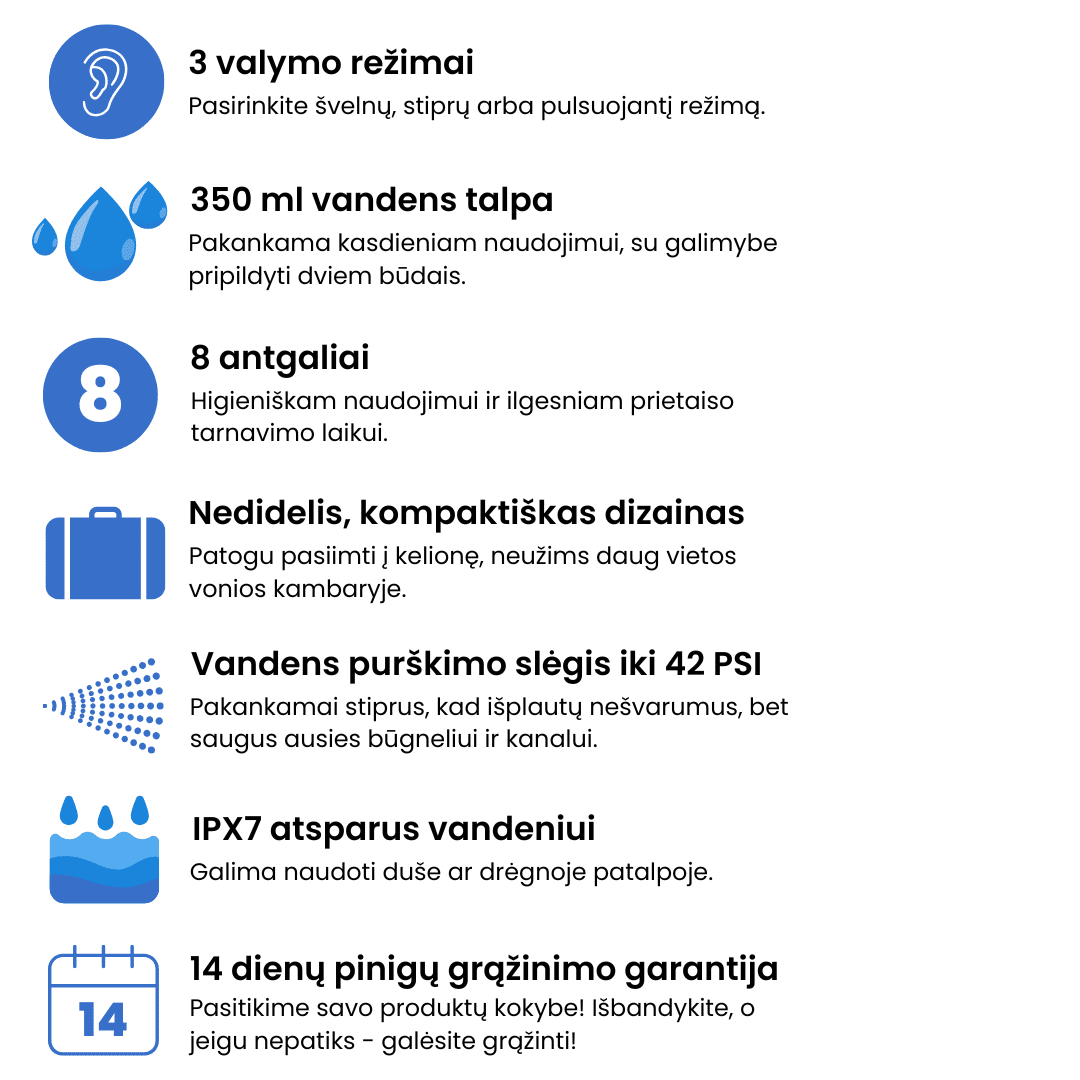 Pulsuojanti vandens tėkmė švelniai masažuoja ausies kanalą ir užtikrina švaros pojūtį.